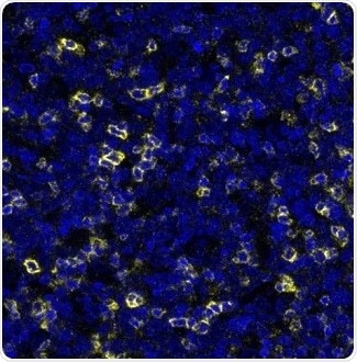 Figure 3. Detection of human TIGIT (yellow) in FFPE human tonsil. Antibody: Rabbit anti-TIGIT recombinant monoclonal [BLR047F] (A700-047). Secondary: HRP-conjugated goat-anti-rabbit IgG (A120-501P). Substrate: Opal. Counterstain: DAPI (blue). Image Credit: Bethyl Laboratories Inc.