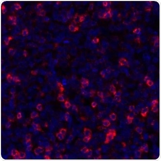 Figure 2. Detection of human TIGIT (red) in FFPE human tonsil. Antibody: Rabbit anti-TIGIT recombinant monoclonal [BLR047F] (A700-047). Secondary: Dylight 594 conjugated goat-anti-rabbit IgG (A120-101D4). Counterstain: DAPI (blue). Image Credit: Bethyl Laboratories Inc.