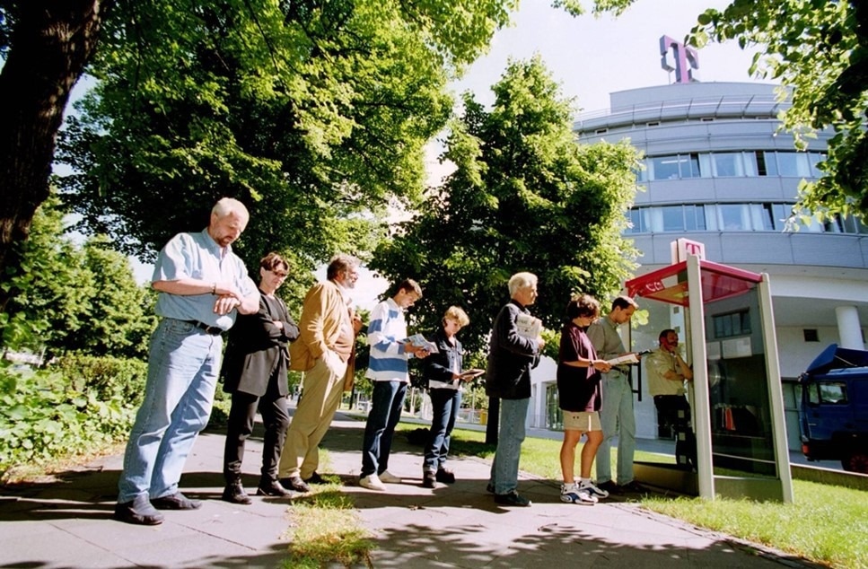 A long waiting queue in front of a phone booth exemplifies the challenges of centralized systems (left). Decentralization at epitome by having own personal pocket-size smartphone (right). Image Credit: istock