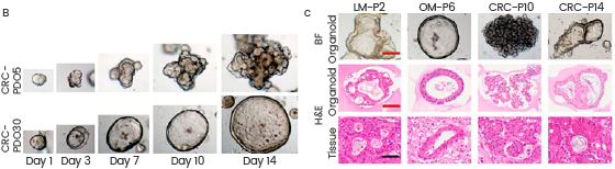 (B) Time course culture of mCRC organoids with different morphologies. (C) Histopathological features of primary tumors and Patient Derived Organoids. Source: https://doi.org/10.3389/fbioe.2023.1190637