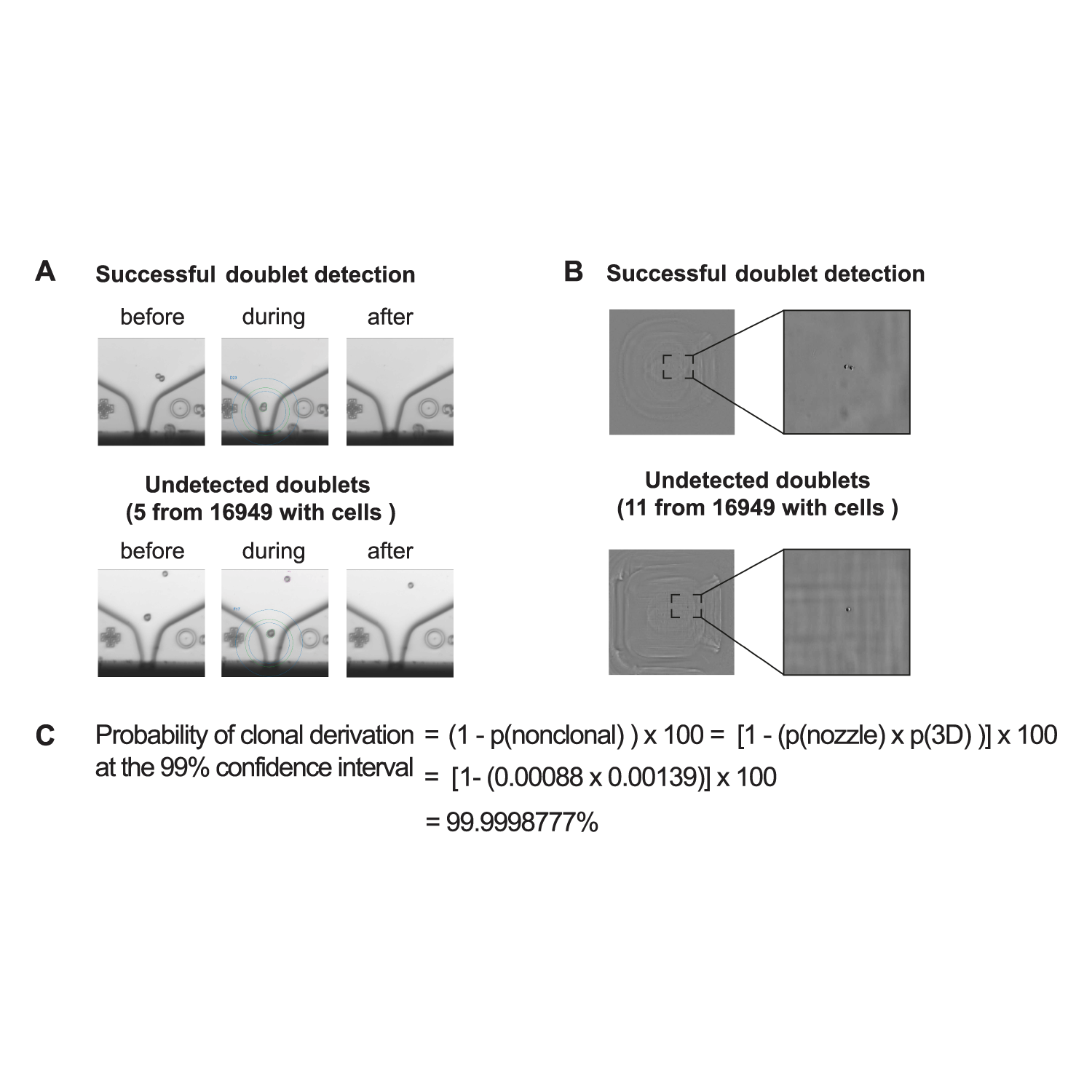 A) Nozzle images. Top: doublet detection. Bottom: no doublet detection; nozzle imaging system fails at detecting the doublet. This accounts for the nozzle system detection error. B) Individual stack images from 3D well imaging. Top: doublet detection. Bottom: no doublet detection; 3D well imaging system fails at detecting the doublet. This accounts for the 3D well imaging system detection error. C) A clone is of non-clonal origin if both imaging systems failed to detect a doublet. The error rate of each imaging system was statistically derived with the Wilson Method after image inspection and the resulting probability of clonal derivation was calculated as shown. Image Credit: CYTENA GmbH