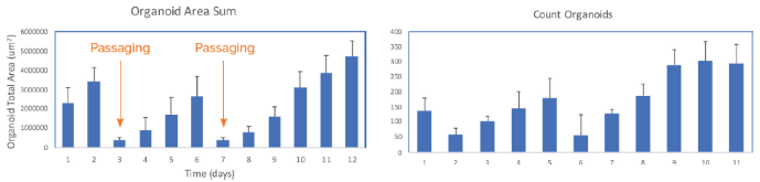The software makes it easy to review organoid domes throughout the culture process and offers real-time analysis and time course plots representing various measurements. Data can also be exported into an Excel datasheet for further analysis. Figure 6 exhibits changes in organoids' area sum and number of organoids over time.