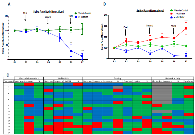 Figure 3. Blinded compound screening on a cortical tri-culture axoModel, with electrophysiological endpoints measured on the Axion Maestro MEA system. For more details on Axol Bioscience’s tri-culture protocol timeline, please see the QR code at the bottom. (A) Example spike amplitude data for vehicle control and Compound 2 (a “Blocker”) (B) Example spike rate data for vehicle control, Compound 1 (a “Hyperpolarizing Activator”) and Compound 4 (an “Inhibitor”). Statistical significance was assessed by two-way ANOVA. (C) Heatmap of the monitored parameters on the Axion MEA for the blinded compound list. Seventeen compounds were tested in total, with nine novel compounds of undefined action, two anonymized proprietary compounds, designated Compound A and Compound B, and six compounds of known action. Each parameter was color-coded GREEN for Unchanged, RED for Increased and BLUE for Decreased compared to the vehicle control.