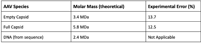Table 1 highlights theoretical and experimental molar masses and related fractional errors. Fractional errors arise from concentration uncertainties (pooling of mixed and empty capsids), neglect of the interaction term (A2), and Mie scattering effects (angular dependence of non-Rayleigh scatterers).