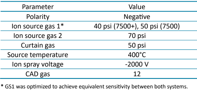 The robustness of the SCIEX 7500+ and SCIEX 7500 systems was assessed in an accelerated manner using an aggressive sample preparation technique and missing the diverter valve.